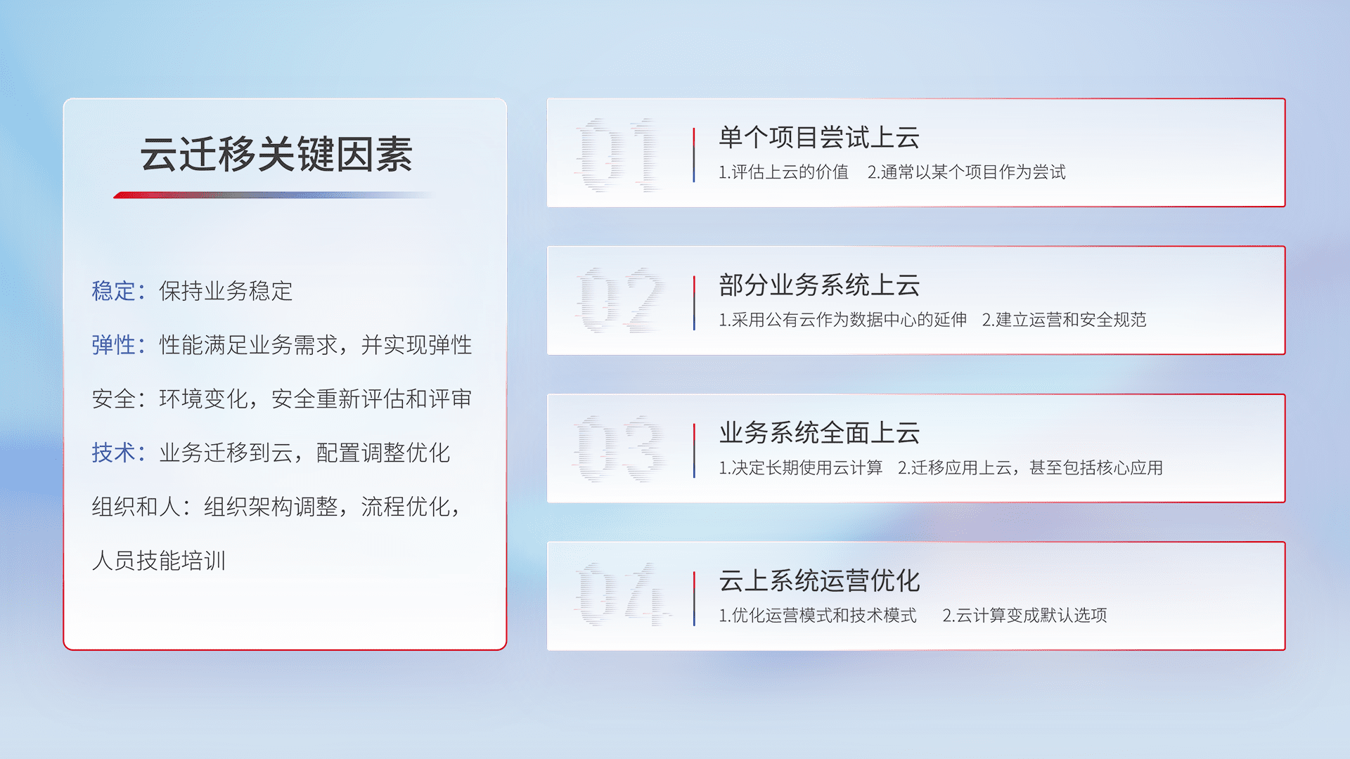 结合实际业务,,,,从规划设计、、、云平台选型、、、、云原生改造、、、、数据迁移、、、、集成交付,,迁移全过程为客户识别最佳上云路径,,,,做好风险识别管理,,,设计网络架构、、、、身份权限、、、、安全审计合规、、操作审计、、、、日志审计、、、、监控告警策略、、、多站点容灾设计等,,,对云上基础设施进行整体规划,,提升IT治理水平,,,,以满足弹性、、、高可用、、、、高性能的需求。。。