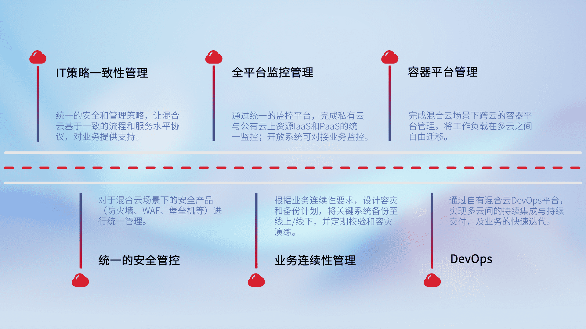 通过多云纳管,,以统一的资源数据模型把客户的云资源进行抽象和封装,,,进而实现对多云资源的统一操作,,,,保障云资源管理的可靠性、、稳定性与可用性。。。。量身定制化运维内容,,,配置、、、开发运维、、、、补丁管理、、备份、、、、监控、、、认证和访问管理、、、审计和日常巡检等,,,,保障在用云过程中的可靠度,,,稳定度以及高可用率。。。