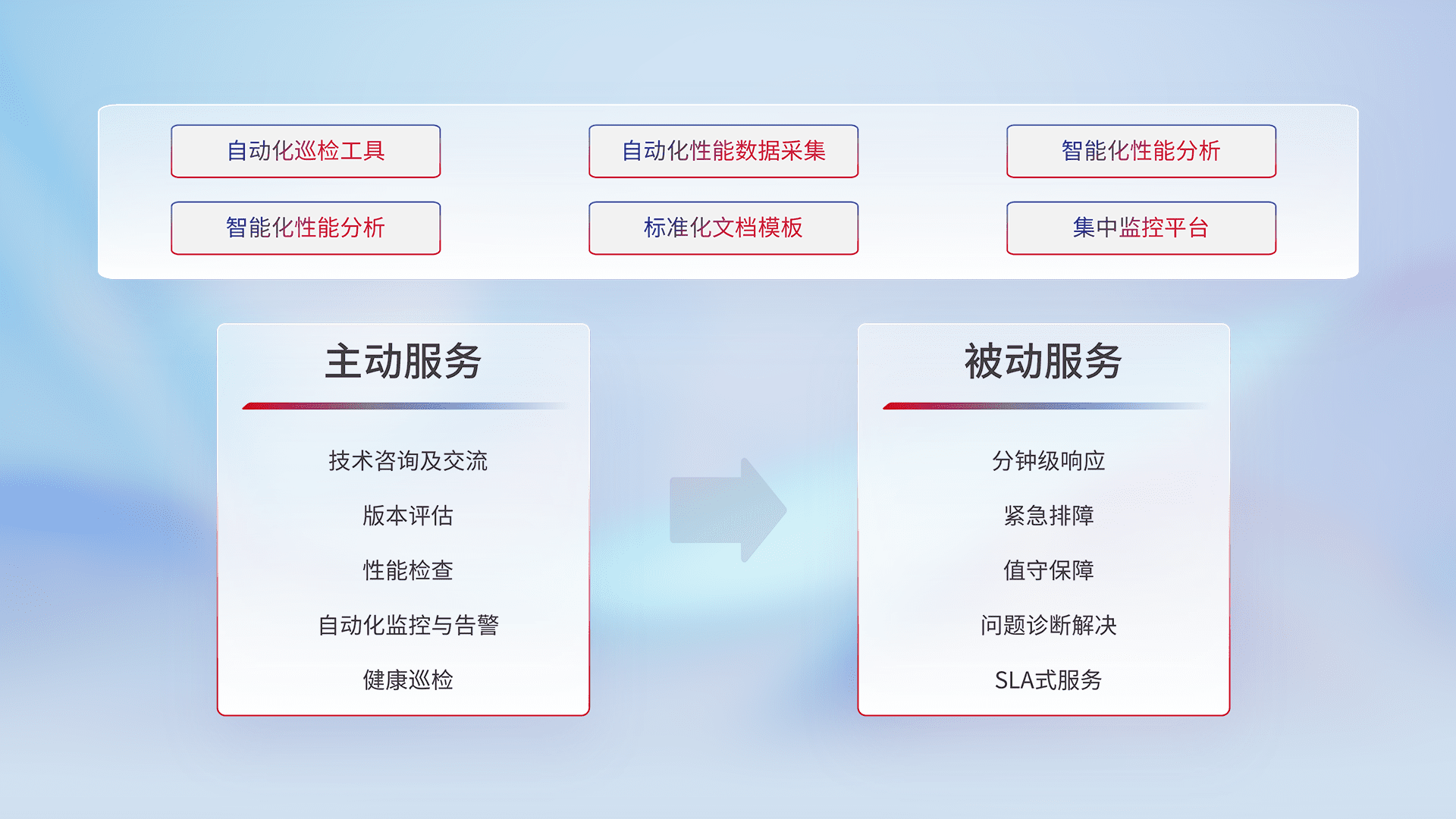 智能化工具和标准化文档,,,保障服务质量,,提供主动服务(包含技术咨询、、、、版本评估、、、性能检查、、、、自动化监控与告警、、、健康巡检)和被动服务包含(分钟级响应、、紧急排障、、值守保障、、、问题诊断解决、、SLA服务)。。。