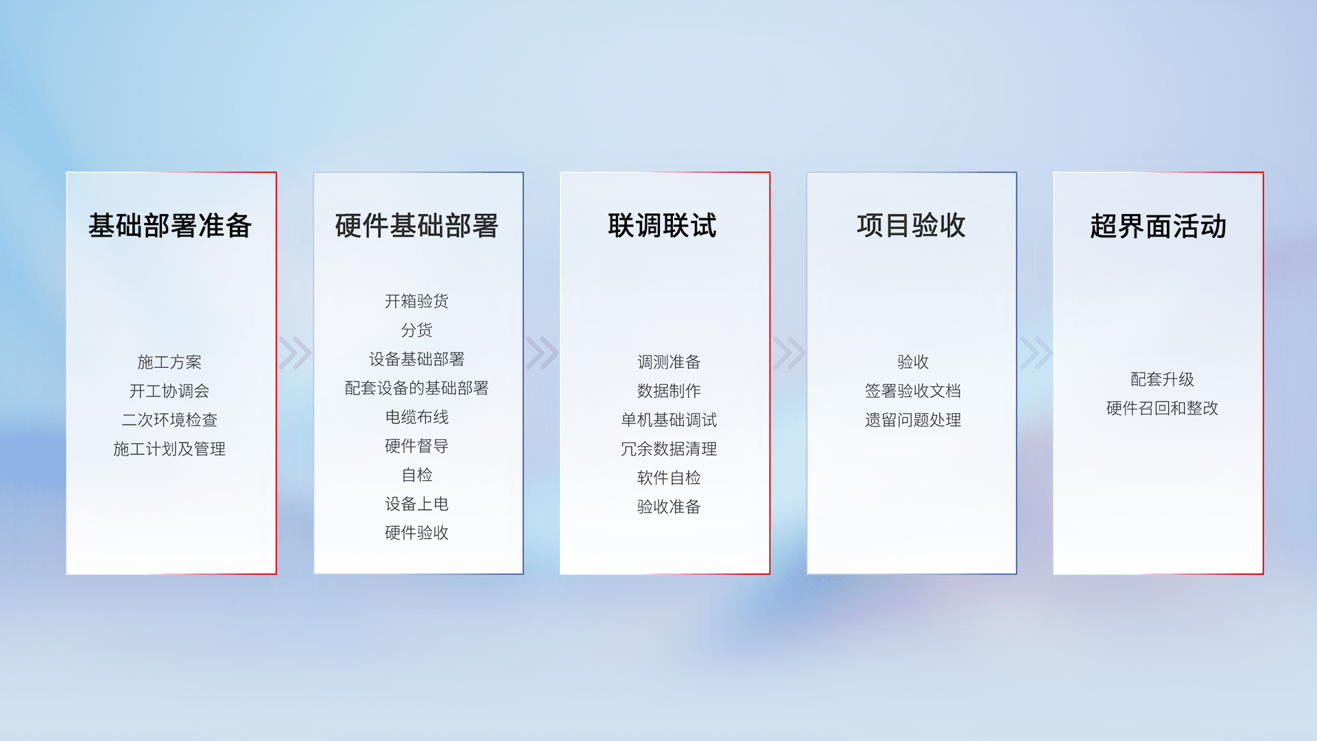从基础部署准备、、、硬件基础部署、、、、联调联试、、、项目验收、、、、越界面活动的全过程可追溯,,,,保证施工质量和进度。。