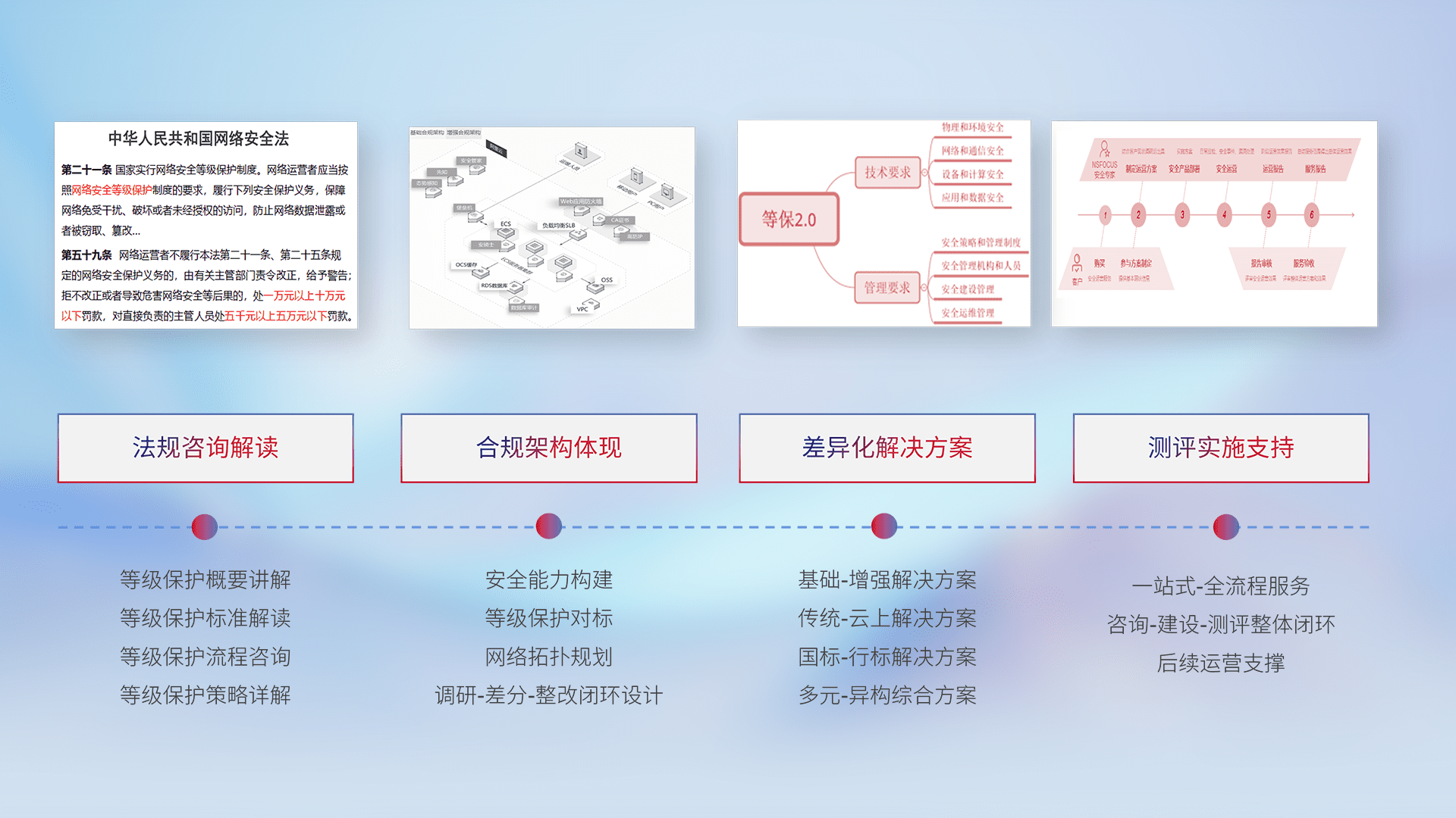 通过专业的法律咨询解读、、合规架构体现、、、差异化解决方案、、测试实施支持等服务,,为客户量身打造等保合规体系。。。
